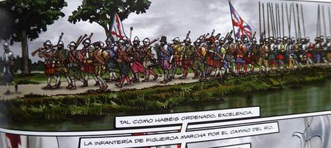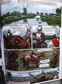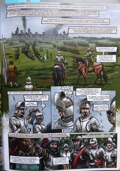Se produit alors la bataille de Dalen ou Rheindalen, du 25 avril 1568, qui marque le début de la guerre de Quatre-Vingts Ans aboutissant à l’indépendance des Provinces-Unies avec le traité de Westphalie en 164814. Cette fameuse bataille est commandée par Joost de Soete du côté des troupes de Guillaume d’Orange et par Sancho d’Avila et Sancho de Londoño du côté du duc d’Albe. Alternant plans rapprochés et plans larges, dans une écriture et un rythme proches du cinéma, le lecteur assiste à la violence d’un combat rapide (« à peine une demi-heure ») entre la cavalerie espagnole et les troupes de soldats allemands et français qui, bien que plus nombreux, capitulent avec de grosses pertes humaines dont la grande vignette dévoile le triste carnage : « autour de mil cinq cents hommes» contre moins de deux-cents du côté espagnol souligne Antonio Gil dans un cartel explicatif.