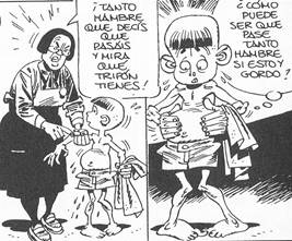 En “Piscurros” (Paracuellos 3), los niños padecen un hambre tremenda, pero, con todo, tienen una barriga enorme y entonces empiezan a sentirse culpables (“¿Cómo puede ser que pase tanto hambre si estoy gordo?”), por culpa de los adultos (“¡Tanto hambre que decís que pasáis y mira qué tripón tienes!”, fig. 3). Este pequeño episodio recuerda una realidad bien conocida de la posguerra: las consecuencias físicas de la desnutrición. Lo que no se explicó en aquel entonces es que la desnutrición provoca una inflamación de gases que desemboca en un vientre hinchado. Aquello le sucedió a cada niño con falta de alimentos. Notamos aquí cómo la violencia física puede conllevar también otra forma de violencia, la violencia moral.