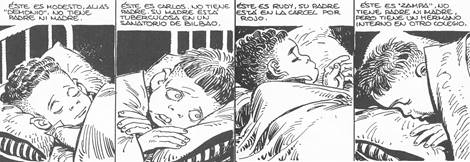 Pero el caso más interesante de violencia en el cual hay que detenerse un poco más es el de la violencia simbólica10. Muchos de los niños son hijos de republicanos fallecidos durante la Guerra Civil, ya que, cuando fue creado en 1936 por Mercedes Sanz Bachiller, el entonces llamado Auxilio de Invierno tenía como finalidad dar una solución al creciente número de huérfanos producidos por la Guerra Civil y los bombardeos. Así, el centro estaba animado por un “esprit de vengeance aigüe”11 para con estos niños que representaban a los vencidos de la guerra, reproduciendo, pues, la filosofía de la victoria desarrollada por Franco12. En efecto, en el episodio “Noche de Reyes” (Paracuellos 1) se nos presenta la explicación de la presencia de los niños en el centro pedagógico de Paracuellos de Jamara. El encadenamiento de las distintas viñetas sin espacios entre ellas es una especie de panorama de la España franquista de posguerra. Observamos la trascendencia de la orfandad (Modesto) por culpa del fallecimiento de los padres en la guerra; la presencia de la enfermedad (Carlos, representación de la historia del propio Giménez desarrollada en “Los Nuevos”, en Paracuellos 2) con su parangón, la tuberculosis13; el encarcelamiento de los padres rojos con Rudy, sin olvidar que el padre de Adolfo Martínez Carrillo fue encarcelado por lo del “estraperlo”14 (“había que vivir, ¿no?”). De ese modo, Giménez ofrece un verdadero panorama sociológico de los vencidos de la Guerra Civil.