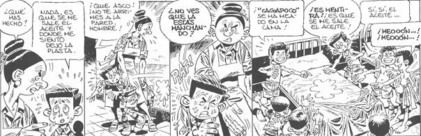 Las prácticas desviadas llevan a una humillación por parte de la sociedad franquista para erigir una figura negativa que la gente no ha de reproducir. Es lo que le pasó a la señorita Felisa, pero los niños padecieron también aquella dinámica de la humillación ejemplificadora llevada a cabo por el franquismo. Por ejemplo, el aceite de ricino dado al niño apodado “Cagapoco” forma parte de ese mecanismo. El niño no puede contenerse y está muy avergonzado porque todos repiten “qué asco”, “qué porquería” o “meón” frente a su situación. Aquí, Giménez alude a la forma de represión, muy habitual por parte del régimen, de humillar a los vencidos, especialmente a las vencidas que salían por la noche o se dedicaban al estraperlo, obligándolas a “ingerir aceite de ricino para que sus efectos laxantes fueran vistos en público. La consiguiente humillación era el objetivo, acompañada de la mofa sobre lo ocurrido”30.