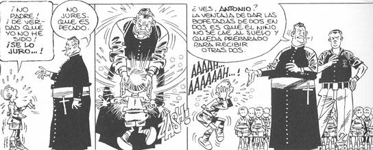 La religiosidad está omnipresente en toda la obra y en todo el discurso franquista. Esto es revelador de la ideología franquista mediante la férrea alianza entre el trono y el altar. Como recuerda Bartolomé Bennassar24, en el clima de posguerra muchos españoles volvieron a encontrar la vocación religiosa: el número de vocaciones no dejó de aumentar hasta el año 1955, y las ordenaciones alcanzaban el millar en los años 1954-1956. Aquellas vocaciones se desarrollaban en las clases medias de las ciudades e incluso entre el mundo obrero. Este auge de la religiosidad se encuentra en la obra a través del personaje del “misas”, que quiere hacerse cura y se pasa el tiempo rezando solo o con otras personas, ya sea con la señorita Delfina Delicado (“A Dios rogando”, Paracuellos 5), ya sea con el grupo de “los cruzados eucarísticos” (“Las vacaciones”, Paracuellos 3), con los brazos en cruz. Aquella religiosidad exacerbada y su pseudocrítica por parte del “testigo-partícipe”25 se materializa en el episodio “¡Rezad, rezad, malditos!” (Paracuellos 2). El nuevo, que acaba de ingresar en el hogar del Auxilio Social, no sabe rezar y debe aprender las oraciones: mientras está aprendiéndolas, dice “siu, siu, siu” en vez de la oración. El nuevo viene sorprendido por la frecuencia de las oraciones (“¿Otra vez a rezar? ¡Pues sí que se reza aquí!”) y un amigo le contesta en cinco viñetas: