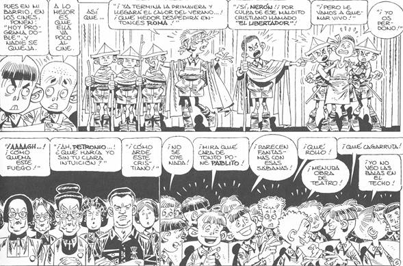 La última forma de evasión que nos parece relevante es la obra de teatro puesta en escena en el hogar, “Teatro”, en Paracuellos 3. Durante las vacaciones, Gaspar había visto al actor Peter Ustinov en el rol del emperador Nerón en Quo Vadis (1951) y decide montar una obra de teatro basada en esta película y en unos elementos añadidos del tebeo El Libertador de Manuel Gago. La directora del hogar acepta que se realice la representación de la obra (tienen unas sabanas viejas para disfrazarse de romanos; usan el teatro del hogar). Pero lo más interesante es lo que se sobreentiende en la obra con respecto al contexto franquista. En efecto, sabemos que el franquismo solo autorizó películas que cuadraban con la ideología del régimen. En dicha obra, Nerón quería castigar a los cristianos. Los niños retoman entradas de la obra (“–¡Qué hedor despedirá entonces Roma! –Sí, Nerón… Por culpa de esos malditos cristianos… ¡Tenemos que echarlos a las fieras! […] ¡[Al libertador] Le vamos a quemar vivo!”) y es esa escena la que está representada ante nosotros, los lectores. En ese contexto de represión de los rojos y otros ‘desafectos’ por parte de los franquistas, ¿no se podría ver una analogía entre la represión franquista y la represión de Nerón contra los cristianos? La reacción del público es llamativa: los adultos notan la seriedad del caso y se quedan mudos, firmes y fríos, mientras que los niños se burlan de sus compañeros actores porque no ven la doble lectura posible de la obra. Así, incluso en la evasión buscada por los niños, el franquismo está presente controlando las distintas publicaciones de ocio infantil47.
