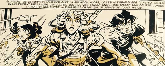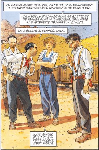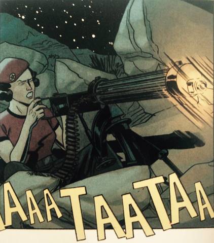 Beaucoup de femmes en armes et en uniformes sont visibles : Lulia et Ornella dans Double 7, Jeanne et Nicole dans Sept Athlètes, Verdad dans Verdad, Fé, Esperanza et Caridad dans Insoumises, Diane dans Hindenburg, Amélie et Aneschka dans Mattéo. Joaquina Dorado, Soledad Estorach, Eriqueta Rovira et leurs camarades dans Au cœur du rêve, etc. Nous voyons ces personnages porter les armes et se battre dans plusieurs histoires, avec des cases où elles sont les seules personnages actifs : Lulia dans Double 727, les Insoumises28, la camarade de Verdad29, Aneschka dans Mattéo30, Diane dans Hindenburg31, Nicole et Jeanne dans Sept Athlètes32. Ce peut être une incarnation très féministe car une combattante en armes s’empare d’une fonction dévolue traditionnellement aux hommes dont les femmes sont exclues par des préjugés et des discriminations sexistes, la norme étant le non accès des femmes à la violence pour le maintien de l’ordre social patriarcal. Laisser les femmes accéder à la violence (tirer avec un fusil, donc potentiellement tuer) c’est bouleverser la division des genres. Le pouvoir de violence est distribué de manière inégalitaire selon le genre pour préserver l’ordre de la domination sexuelle, celui qui a le monopole de la violence ayant le monopole du pouvoir.