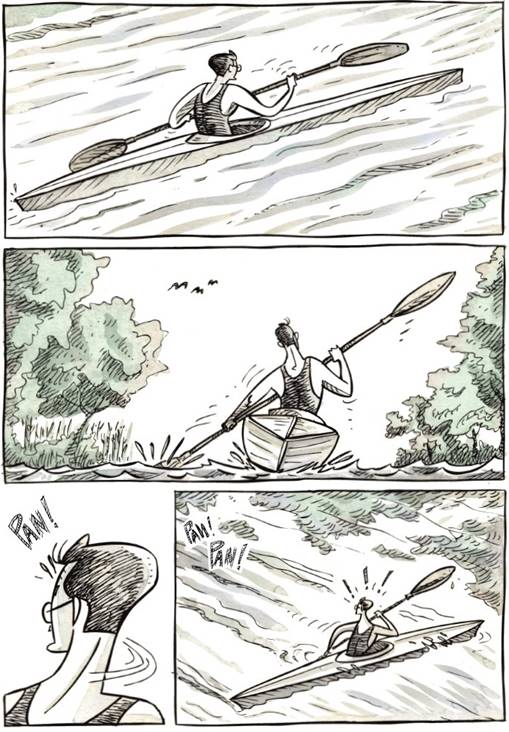 Tout d’abord la guerre s’invite par le bruit. Elle s’approche peu à peu5 (fig. 1). Les bruits des canons s’annoncent dans la dernière vignette de la planche suivante. Celle-ci perturbe aussi la forme de la planche6, elle s’immisce dans la vie quotidienne, lors des loisirs d’Uriel quand il fait du canoë7 où il repêche un corps sans vie, scène macabre qui occupe pratiquement toute la planche. Le bédéiste organise une progression démonstrative de la destruction de l’homme par la guerre qui est plus prononcée dans certaines séquences, notamment les exécutions en masse dans la planche 61. Le choix d’un montage visuel judicieux permet de mettre en relief ces exécutions8 (fig. 2 et fig. 3), notamment l’usage du plan horizontal qui fait écho aux modalités cinématographiques.