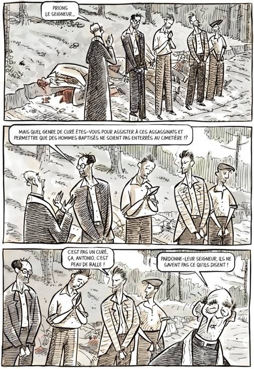 Les plans panoramiques sont des scènes d’actions rapides, celles de franquistes exécutant des hommes pour ensuite les laisser dans la nature, représentés par un amas de cadavres9. Ce phénomène de dramatisation visuelle de ces deux planches, parmi d’autres, rappelle la réalité de la guerre qui a fait de nombreux morts. La présence du curé, représentant de l’Église qui assiste, impassible à ces assassinats, ne fait qu’accroître la colère et le dégoût d’Uriel, traduit dans la dernière vignette de la planche 61 qui accentue les ressentis émotionnels de celui-ci. D’ailleurs, des passages similaires scandent l’opus graphique. Toutefois, pour amplifier l’horreur, le bédéiste choisit une esthétique visuelle qui repose sur la métonymie : une tête de l’homme qui souffre, le zoom sur les mains ou une tête d’un homme agonisant. Toutefois, il faut remarquer que, dans l’ensemble, les volumes 2 et 3 sont plus centrés sur la réalité des conflits, la vie et le quotidien difficile des soldats dans les camps et les tranchées qu’ils partagent dans l’horreur.