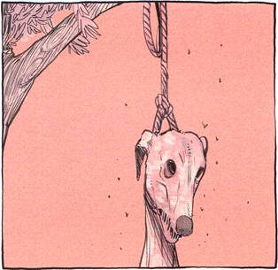 La corde du pendu, les yeux caverneux du lévrier qui annonce la décomposition de la chair à laquelle contribue une nuée de mouches amènent inconsciemment le lecteur dans un univers putride. Sans que cela ne soit dit, la scène renvoie à des rites ancestraux de la chasse en Espagne où, à la fin de la saison, les chiens jugés déméritants, accusés de salir l’honneur de leur maître, sont punis, mutilés, asphyxiés par pendaison lente. Carrasco est plus précis dans le roman lorsqu’il écrit que
