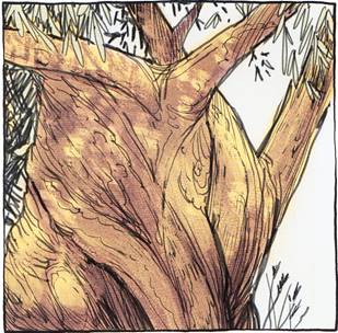 La troisième vignette du prologue, enfin, montre en gros plan le tronc noueux d’un olivier. Tant le dessin que le texte qui l’accompagne insistent sur la personnification de l’arbre, qui semble la dernière présence vivante de ce qui pourrait bien ressembler à un far west. La comparaison avec une ligne de soldats blessés au retour du front ajoute au tourment du dessin. La torsion du tronc montre la résistance de l’arbre à toutes les affres de la nature et du climat. Seule sentinelle encore debout dans ce paysage dévasté, l’olivier n’est plus seulement le gardien du lieu, il est aussi le gardien du temps. La longévité exceptionnelle de cet arbre emblématique des climats méditerranéens le rapproche du divin, de l’immortalité, de l’intemporalité, de l’immuable. Mais l’olivier symbolise aussi la force de vivre, la résistance à toutes les difficultés : c’est le dernier espoir de la nature quand plus rien ne reste. Ne voit-on pas là dans cette troisième vignette un contrepoint à la première, celle du chien pendu ? L’auteur ne nous annonce-t-il pas là dès le prologue un cycle de vie qui donne lieu d’espérer ?