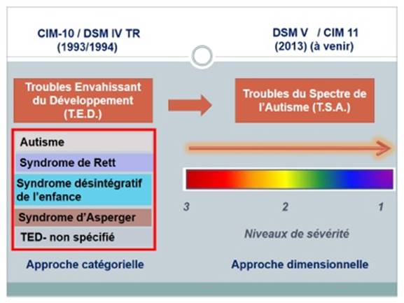 Le trouble est envisagé sur un continuum avec des niveaux de sévérité et apparaît sous le terme de « trouble du spectre de l’autisme » (T.S.A.). Dans cette nouvelle classification, les altérations des interactions sociales et de la communication sont regroupées en un seul domaine et le caractère restreint et répétitif des intérêts et des activités constitue le second domaine altéré (dyade autistique).