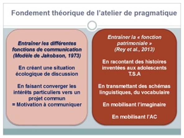 The Autism Spectrum Disorder (A.S.D.) is a neurodevelopmental disorder characterized by a deficit in communication and social interaction as well as limited, repetitive behaviours and interests. In this article, we explain how certain cognitive theories of autism echo theories of the pragmatics of language. Then, in the framework of a linguistic approach of the semiology of communication disorders, we show how we have questioned the work of Jakobson (1963) on the functions of language and that of Rey et al. (2013) on the concept of “patrimonial function” in order to develop a remediation of the pragmatics of language in A.S.D. After these theoretical considerations, we present the methodology and the initial results of the experimental “pragmatics workshops” put in place at the Autism Resource Centre of the Provence Alpes Côte d’Azur region.