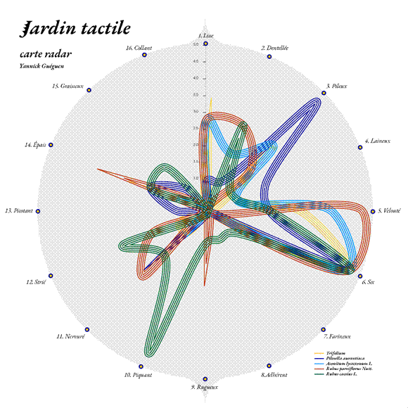 Les descripteurs opposés ont été utilisés pour réaliser une carte radar (ou carte polaire). Cet outil permettait de schématiser l’importance de chaque dimension tactile de la plante, d’en relier plusieurs dimensions, tout en comparant des plantes à partir du même principe de visualisation. En se servant de la carte radar, une personne pouvait prendre conscience de ses sensations, les interroger, les différencier, les affiner en les traduisant en mots, autrement dit, en prenant conscience de ce qu’elle ressentait. Après avoir demandé à un groupe de testeurs de se servir de la carte-radar et des termes prédéfinis pour qualifier le contact avec les feuilles, les résultats ont été comparés, les différences ont été notées.
