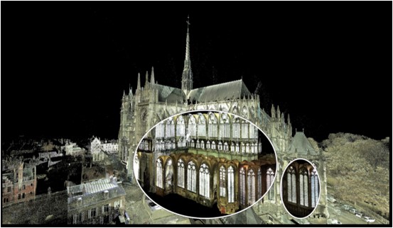 Notons que le jumeau virtuel de la cathédrale peut aussi porter les traces des restaurations : les contours d’un échafaudage sont visibles dans le chœur. C’est bien la preuve que le nuage de points n’est pas une abstraction mathématique intemporelle mais un relevé exhaustif du monument à un instant T.