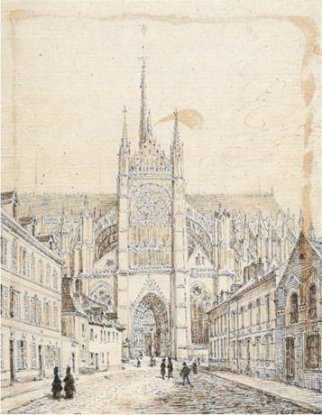 Aimé et/ou Louis Duthoit (1803-1869) (1807-1874) : Amiens : vue du bras sud du transept de la cathédrale depuis l’ancienne rue du Cloître Saint-Nicolas, après son élargissement, 1872, Amiens, Musée de Picardie, in Catalogue de l’exposition Aimé et Louis Duthoit. Derniers imagiers du Moyen Âge, Amiens, 2003, Cat. 212, p. 94.