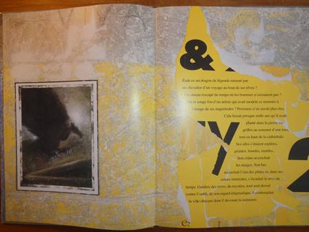 Sur la première double-page du récit51, on voit sur la page de gauche ce qui évoque un tableau, par son cadrage, où dominent les couleurs sombres avec des effets de gradation, représentant à l’intérieur une sorte d’immense oiseau noir s’apparentant à un dragon avec ses serres puissantes, dont on peut imaginer qu’il vient de se poser sur le haut d’un édifice.