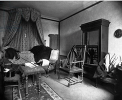Qu’il s’agisse d’images où l’on raconte autre chose, ou d’images où l’on raconte la même chose, mais autrement, trois exceptions peuvent être toutefois repérées. La première concerne un portrait de Marguerite Audoux (Fig. 15a et 15b), qui se distingue par sa capacité à assumer l’ordinaire, laquelle fait s’interroger sur les causes de ce phénomène, qu’il s’agisse du genre, de l’appartenance sociale, ou du fil signifiant reliant l’œuvre à la manière de se donner à voir. Une autre exception portant cette fois sur le mécanisme de déchiffrement est illustrée par le cas de Jules Barbey d’Aurevilly (Fig. 16), cas de représentation in absentia puisque la photographie posthume montre l’espace sans l’écrivain. Dès lors, les objets possèdent une fonction mémorielle, commémorative, et produisent un effet de nature morte, via la fixation d’un état des lieux au moment de la mort qui ne laisse que l’indicialité des objets : la canne posée, de guingois, sur la table, semble prête à servir ; les vêtements, juste enlevés, sont en désordre. Quant à l’hypertrophie ornementale, illustrée par les cas de Gyp ou de Loti (Fig. 17), elle est une autre forme de surdétermination de l’espace domestique.