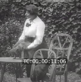 Fig. 35. Colette cajolant ses deux chats et son chien. Archives Gaumont Pathé. Image arrêtée.