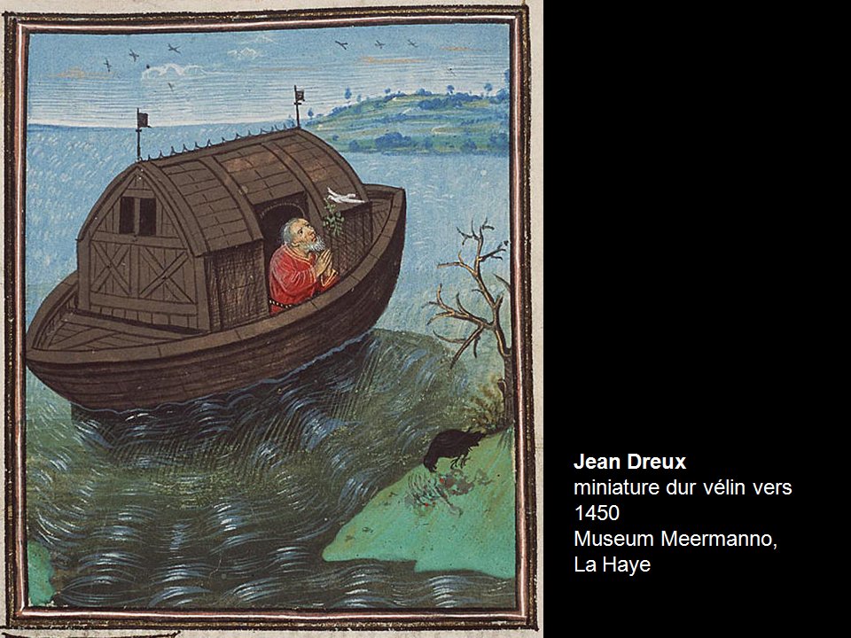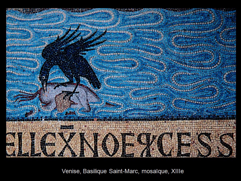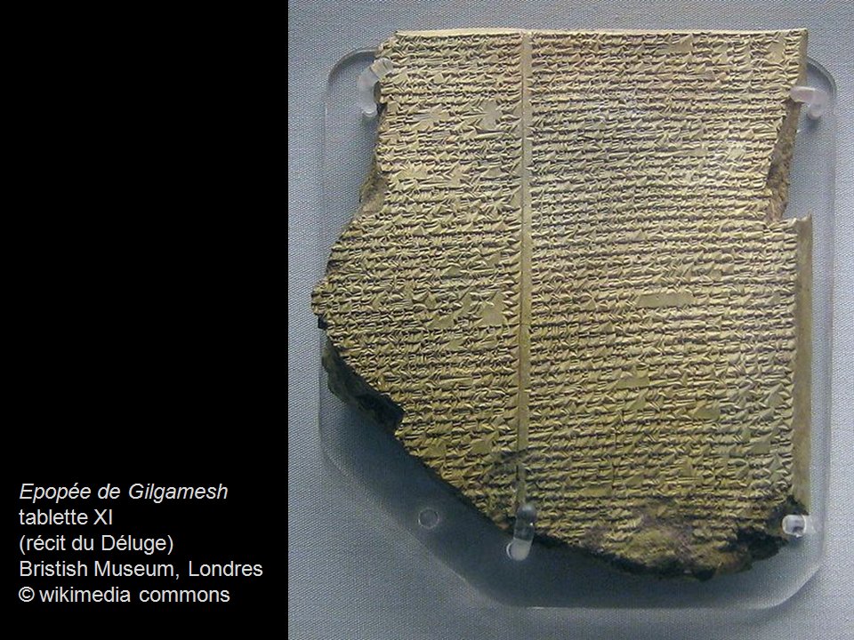 On sait que l’épisode biblique du déluge prend sa source dans la littérature mésopotamienne, en particulier dans la tablette XI de la version ninivite de l’Épopée de Gilgamesh34. Depuis la mort de son ami Enkidu, le roi Gilgamesh a pris conscience de sa condition mortelle et part à la recherche de son ancêtre Uta-napishti qui jouit de l’immortalité. En un lieu situé au-delà des eaux de mort, dans l’île des Bienheureux, Uta-napishti, pressé par son visiteur, finit par raconter comment il a échappé au déluge. Un jour, les dieux mésopotamiens ont décidé d’anéantir les hommes, devenus soit trop nombreux, soit trop bruyants. Mais le dieu des eaux ne peut se résoudre à cette destruction totale et prévient Uta-napishti du danger qu’il encourt. Il lui enjoint de construire un bateau pour échapper à la catastrophe universelle et d’y faire monter sa famille, tout ce qu’il possède, biens et animaux, ainsi que les artisans qui l’ont aidé dans le chantier. Après six jours et sept nuits de pluies torrentielles qui effraient même les dieux, le bateau finit par s’échouer sur le sommet du mont Niçir. Pour s’assurer de la baisse des eaux, Uta-napishti lâche, dans un premier temps, une colombe, puis une hirondelle qui reviennent vers lui, faute de pouvoir se poser. C’est alors le tour du corbeau de partir en éclaireur. L’oiseau constata rapidement que les eaux se retiraient ; il trouva un coin de terre ferme, « picora, croassa ( ?), et s’ébroua »35 mais ne revint plus. Uta-napishti comprit à ce moment-là que la terre était à nouveau complètement émergée.
