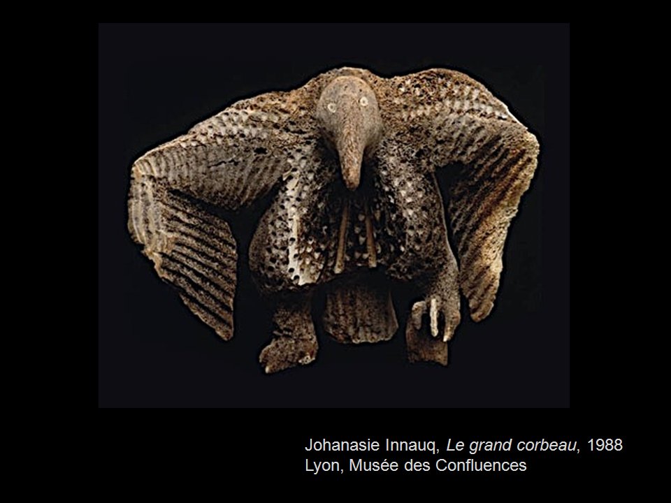 [37] Voir Cécile Pelaudeix, « Le grand corbeau, hérault d’un temps mythique », Pôles magnétiques, 2010-2011, p. 106-107. Également Guy Bordin, « La nuit inuit. Éléments de réflexion », Études/Inuit/Studies 26 (2002), p. 45-70, et Frédéric Laugrand, « Le mythe comme instrument de mémoire. Remémoration et interprétation », Études/Inuit/Studies 23, 1999, p. 91-115. À titre d’illustration, on renverra à la sculpture en os de baleine d’Illauq Johanasie, Large raven, 1988, Clyde River, Nunavut – présentée dans l’exposition permanente Origines, les récits du monde, au Musée des Confluences à Lyon.