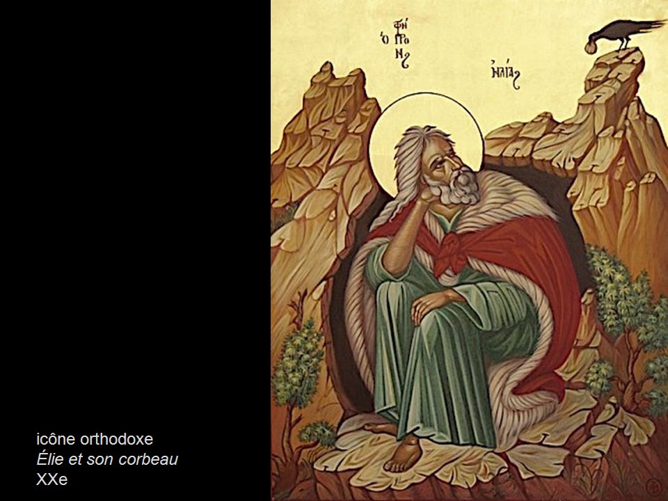 Nous sommes au neuvième siècle avant J.-C. Après le schisme qui suivit la mort de Salomon, le royaume d’Israël (ou du Nord) est gouverné par le roi Achab (-874/-853). Jézabel, son épouse phénicienne, l’entraîne dans l’idolâtrie en introduisant le culte de Baal et d’Astarté jusque dans la capitale, Samarie. Mais le prophète Élie le Thesbite dénonce les exactions commises par le couple royal et le menace du jugement divin. La pluie cesse de tomber pendant trois ans sur le pays et déclenche une longue sécheresse. Pour se protéger de la colère royale, Élie est obligé de s’exiler et, selon l’ordre de Yahvé, il va se cacher dans les gorges encaissées du torrent de Kerrith (ou Chorrath), au-delà du Jourdain. Le premier Livre des Rois (ou troisième livre des Règnes), qui rapporte l’épisode, précise que, dans ce lieu solitaire et reculé, « les corbeaux lui apportaient du pain et de la viande le matin, du pain et de la viande le soir », comme Dieu l’avait ordonné38. De là, l’expression devenue proverbiale « être ravitaillé par les corbeaux ».