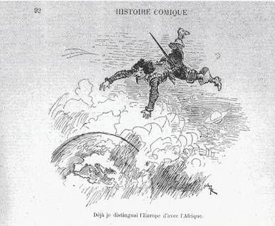 Avant de commencer, notons, un peu par plaisanterie, que le premier départ du narrateur (vers la Lune) est suscité par une discussion au sujet de l’existence controversée d’autres « mondes », c’est-à-dire de terres habitées, éventuellement par des « hommes »5, en dehors de la Terre ; cette discussion est suivie de la présence étrange d’un livre ouvert dans sa bibliothèque : « Quoi ! disais-je en moi-même, après avoir tout aujourd’hui parlé d’une chose, un livre, qui peut-être est le seul au monde où cette matière se traite, voler de ma bibliothèque sur ma table, devenir capable de raison […] »6… Chez Cyrano, la pensée, comme les mots, volent souvent.