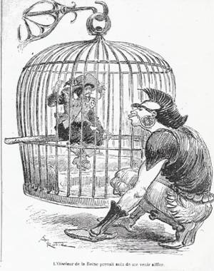 C’est pourquoi les prêtres de la Lune, incapables d’admettre que cet étrange voyageur arrivé à la Cour lunaire soit « humain », bien qu’il ait appris « à entendre leur langue et l’écorcher un peu »31 – notons que cette langue est constituée d’« une différence de tons non articulés, à peu près semblable à notre musique »32 –, décident qu’il ne passera « tout au plus que pour un perroquet plumé »33. Au passage, Cyrano introduit un clin d’œil à une anecdote célèbre de Diogène Laërce : « Platon avait défini l’homme un animal à deux pieds sans plumes, et cette définition avait fait fortune. Diogène pluma un coq et le porta dans l’école du philosophe, en disant : « Voilà l’homme de Platon »34. Si bien que le narrateur est mis en cage. [Fig. 4, source BnF]35.