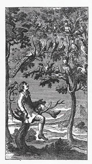 Plus tard, si le gazouillement des oiseaux fait partie de la peinture en quelque sorte conventionnelle du paradis « terrestre » (comme locus amœnus) où se retrouve le héros lors de son atterrissage sur la Lune26, se dessine déjà un thème fondamental dans leur évocation : « là mille petites voix emplumées font retentir la forêt au bruit de leurs chansons, et la trémoussante assemblée de ces gosiers mélodieux est si générale qu’il semble que chaque feuille dans le bois ait pris la langue et la figure d’un rossignol »27. Car une des grandes questions que soulève la figuration fictionnelle des oiseaux est celle du langage : dans quelle mesure, au-delà du plaisir que les humains éprouvent à l’entendre, et de sa relation intime à la musique comme activité artistique humaine, est-il un langage comparable à celui des humains, ce qui suppose qu’ils disposent de raison, en vertu de la double signification du grec logos ? D’une part, le chant des oiseaux semble bien exprimer des émotions, et au moins prouver que ce sont des animaux sensibles (et non des machines), d’autre part pourquoi ne pas les supposer susceptibles de raisonnement ?