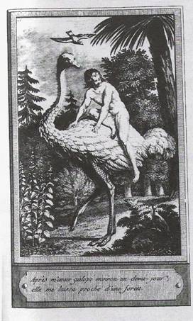 Évidente satire des prétentions de l’Église à s’ingérer dans les questions scientifiques, avec l’appui de quelques savants patentés, en même temps qu’allusion au débat entre instinct (mécanisme) ou intelligence chez les animaux. Comme le bruit qu’il pourrait tout de même être un homme persiste, le narrateur subit un procès, au terme duquel le jury, voyant qu’il ne fait que répéter bêtement (comme un perroquet…) les théories d’Aristote, conclut qu’il est « possible quelque espèce d’autruche, vu qu’[il porte] comme elle la tête droite »38. C’est peut-être là reconnaître qu’il a quelque chose d’hybride, comme est réputé l’être cet oiseau qui ne vole pas depuis l’Antiquité, voire d’hypocrite et d’hérétique, car c’est sa signification allégorique. Ce beau jugement aboutit à le remettre en cage, mais ne l’empêche pas de séduire une lunaire, en tant que bel oiseau [Fig. 5, source BnF]…39