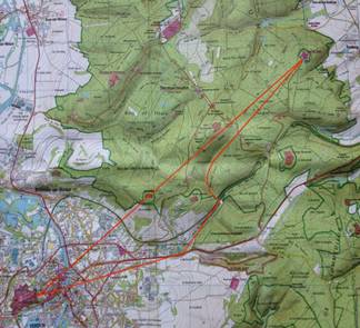 À Vaux, le trajet théorique, en ligne droite et à vol d’oiseau, était de 8 km avec un plateau entre 340 et 360 m, une brusque descente jusqu’à 200 m le long de la côte Saint-Michel puis une petite remontée à la citadelle à 230 m, mais l’animal devait pouvoir couper cette descente. Un autre trajet théorique, un peu plus long (9 km), pouvait consister à passer par les vaux, en pente plus douce et régulière.