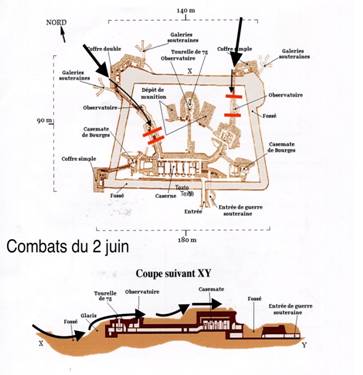Il connut d’abord des conditions très difficiles à Vaux. Attaquant ce fort le 2 juin, les Allemands s’installèrent sur les terrasses pour lancer des grenades, dont des asphyxiantes, dans les coffres Nord-Ouest et Nord-Est (cf. le plan ci-dessus) par lesquels ils pénétrèrent pour progresser dans les gaines menant à la caserne centrale. Ils furent arrêtés aux premiers barrages français dressés à la hâte qu’ils attaquèrent trois fois le 3 juin, à coups de grenades répandant des fumées dans le reste du fort. Leur échec les conduisit, le 4 juin, à employer des lance-flammes et des gaz dans les gaines et par la casemate Sud-Est.