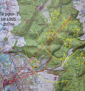Il serait possible de reconstituer l’itinéraire de ce pigeon s’il était allé droit sur Verdun comme le crut Raynal. Mais, au regard de la durée qu’il passa à l’extérieur, on doit se demander ce qu’il fit durant tout ce temps. Deux solutions semblent les plus probables : soit il se réfugia quelque part voire en plusieurs endroits successifs du front en attendant l’accalmie de la fin de nuit ; soit il prit une autre direction pour échapper au bombardement du plateau, se perdit peut-être faute de repère, et ne revint à Verdun qu’avec l’accalmie là-aussi. Dans les deux cas, il arriva malgré la pluie, donc les nuages l’empêchant d’utiliser une carte du ciel stellaire, peut-être en mobilisant son compas magnétique pour se diriger dans l’obscurité, peut-être aussi en pouvant tout de même reconnaître des repères physiques autour de Verdun. Mais il était bien épuisé puisque le colombophile de faction nota qu’il souffrait encore des gaz et qu’il « a failli périr »30.