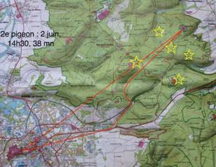 Le deuxième pigeon fut lâché ce même 2 juin, à 14h30, pour informer du début des combats à l’intérieur du fort16. L’animal profita manifestement de l’accalmie maintenue sur le lieu, chaque adversaire n’osant bombarder ses combattants, et d’un pilonnage allemand du plateau « moins intense » qu’en matinée, ramené un temps à la lisière sud du fort pour entraver une contre-attaque ainsi que sur les forteresses de Souville et Tavannes pour empêcher leurs batteries de riposter (avant d’être redéployé en profondeur et intensifié dans l’après-midi), tandis qu’il semble que les brumes s’étaient dispersées puisque qu’elles ne furent plus signalées17. Ce pigeon profita donc d’une fenêtre favorable de lâcher et parcourut la distance en 38 mn, un temps bien plus rapide que le précédent mais tout de même double du normal avec une vitesse moyenne de 12 km/h.