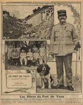 Mais il faut plus l’analyser comme une volonté de glorifier tous les vivants présents, en glorifiant sans le dire, par ricochets, leur commandant, que comme un véritable intérêt car il confondit ensuite jours et heures à propos des deux premiers pigeons, comme il crut avoir envoyé les deux autres le même jour, le 4 juin33. En fait, la vedette animale dans son récit n’était pas le matricule 787-15, ni les autres pigeons, mais le chien Quiqui, né dans les tranchées, apporté par un soldat à Vaux, adopté juste avant la reddition par Raynal pour que les Allemands, qui n’acceptaient que les chiens des officiers, ne le tuent pas, et parti en captivité avec ce nouveau maître. Il devint une célébrité à la sortie du livre car Raynal lui consacra un chapitre, le fit prendre en photo à côté de lui et siéger ainsi en pleine page de journaux comme l’un des héros du fort de Vaux. Mais Quiqui fut vite oublié ensuite.