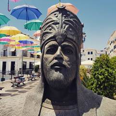 Leur large carrure contraste radicalement avec la représentation tout en rondeur et les traits à peine esquissés du jeune Hicham II, qui semble être une poupée aux mains de son entourage. La représentation du visage du pragmatique chambellan se situe dans une tension entre l’incarnation d’une certaine dignité, rappelant celle de la statue du buste d’Al-Mansour sculptée par Antonio Rico Núñez qui a été érigée à Torrox (Malaga), une de ses possibles villes de naissance, en 2002 , puis répliquée à Calatañazor (Soria)25 en 2007, et sa déformation par un rictus cynique ou haineux, qui permet de le caractériser comme le « méchant de l’histoire » (Fig. 2 et plus bas Fig. 12).
