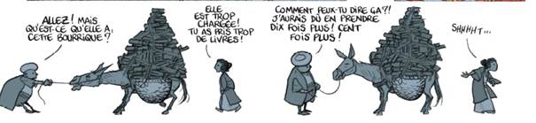 La mule chargée à l’excès de livres, la bibliomule, est dans l’album l’adjuvant qui devient antagoniste, puisqu’elle refuse de se soumettre aux hommes et à leur logique, grâce à une aptitude inébranlable à la résistance plus ou moins passive. Source de nombreux gags visuels, comme l’est aussi le personnage tout en rondeur de Tarid (presque un culbuto), et celui, polisson, de Marwan, elle permet à cette bande dessinée érudite de connecter avec l’univers des bandes dessinées pour enfants (on pense en particulier aux différentes illustrations, adaptations et parodies des Mille et une nuits, de Iznogoud à Ali Baba).