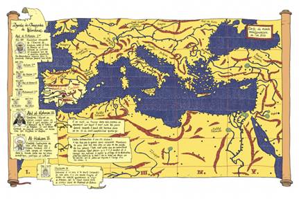 La bande dessinée de Lupano et Chemineau s’ouvre sur une carte du monde méditerranéen en l’an 976, au style archaïsant. De par leur pratique de reproduction de grands espaces à des échelles réduites et le fait que symboles et métaphores graphiques font partie de leur boite à outils, les auteurs de bandes dessinées sont enclins à inclure toutes sortes de cartes qui impliquent une pause dans le récit et permettent de le contextualiser34. Il n’est pas rare dans les bandes dessinées historiques, comme c’est, par exemple, le cas dans Les Indes Fourbes, qu’elles conforment un seuil permettant de situer l’histoire au sein d’un vaste espace, et par le mode de représentation dont elle s’inspire, de plonger d’emblée les lecteurs et lectrices au cœur d’une époque passée35. Dans La bibliomule de Cordoue, il s’agit d’une double page liminaire, qui contextualise donc historiquement et géographiquement, mais également, de par ses couleurs et motifs, constitue une porte d’entrée vers le monde médiéval andalou au moyen d’une technique de l’entonnoir. Son intérêt est enfin de situer Cordoue par rapport à l’Europe du nord, mais surtout par rapport à tout le bassin méditerranéen, incluant le Maghreb (avec le califat fatimide, dont il est question dans l’œuvre), le Moyen Orient (Bagdad, Damas) et l’empire byzantin, déplaçant vers le sud et l’est notre regard habitué à des cartes eurocentrées, d’une façon qui correspond en réalité aux cartes de navigation médiévales ou modernes (portulans) en Méditerranée, ce lieu intense d’échanges commerciaux et humains (Fig. 5)36.
