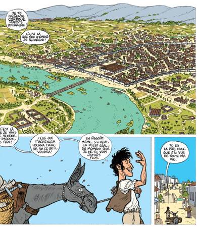 La trame en est classique, et les ressorts correspondent parfaitement à celle des romans historiques médiévaux analysés par José Enrique Ruiz-Domènec : « […] la capacidad de resistencia ante el opresor, la lucidez en medio del dogmatismo, el elogio de la diversidad, el anhelo de libertad »10. Trois personnages subalternes, qui font figure de résistants, empruntent une route semée d’embûches, selon un schéma de conte traditionnel très fréquent dans la littérature jeunesse : l’objet de la quête est de sauver un maximum de livres de la riche bibliothèque du palais destinés à être réduits en cendres. Elle prend la forme d’un road-movie, ou « mule-movie », comme le déclare avec humour Lupano dans un entretien11. En effet, le véhicule en sera une vieille mule revêche qui doit mener les trois personnages principaux, tout d’abord à Batalyaws (Badajoz), ville musulmane, puis, devant le danger qui se précise (ceux qui l’administrent ayant été prévenus de l’arrivée des « voleurs » par pigeons voyageurs), jusqu’à León, c’est-à-dire en terre chrétienne, où réside, contre toute attente, un ami de Tarid, le bibliothécaire en chef de la grande bibliothèque.
