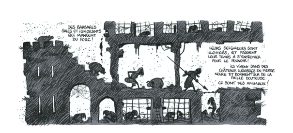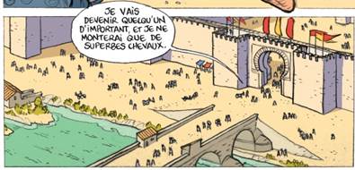 Comme on a pu le voir, il y a, dans l’œuvre de Lupano et Chemineau, collision entre trois horizons d’attente : celui de la recréation du Xe siècle andalou avec un certain didactisme, celui du conte classique et des récits d’aventures, enfin celui de la bande dessinée d’humour juvénile dont on pourrait penser a priori qu’ils se désactivent réciproquement, alors qu’ils me semblent servir le propos historique avec plus d’efficacité que certaines bandes dessinées plus épiques et moins ludiques (je pense, par exemple, aux multiples œuvres consacrées au Cid, généralement dépourvues d’humour). Ces trois niveaux de lecture sont, comme nous allons l’étudier à présent, également servis par la représentation graphique de l’espace physique (Fig. 3).
