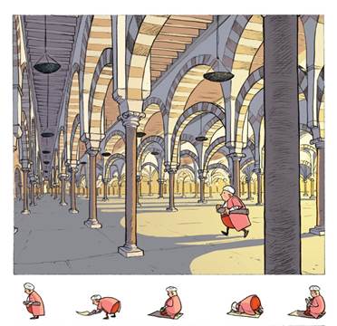 En son sein, la verticalité de la bibliothèque écrase un peu les humains de son importance (elle rivalise avec la mosquée). La centralité de la bibliothèque, structurante pour le savoir, est aussi montrée par les jeux avec l’architecture de la page qui en impose symboliquement au petit Marwan, élève rétif et peu scrupuleux, mais lui offre cependant indirectement accès à bien des savoirs qui lui permettront de survivre (Fig. 10 et 11).
