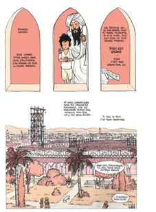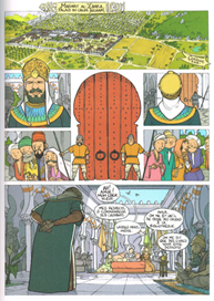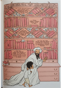 L’histoire de la pensée est représentée par Le livre de l’explication pénétrante d’Ibn Masarra de Cordoue (883-931)45, premier philosophe cordouan d’un longue lignée qui passera par Avempace, Maïmonide et Ibn Roshd (Averroés) jusqu’aux soufis andalous, à proposer une lecture du Coran non littérale, symbolique, compatible avec les découvertes scientifiques. Au-delà des sciences et de la philosophie pré-rationaliste, l’Andalousie fut aussi le creuset de la floraison d’une poésie et d’une musique inspirées par la culture raffinée de Bagdad, qui nourrira les troubadours, préfigurant la naissance de l’amour courtois46. Cette réalité est incarnée dans la bande dessinée grâce au Livre des chansons, anthologie de chants et poèmes arabes, composée par Abu Al-Faraj. Enfin, Chroniques de Cordoue, un livre dont je ne sais pas s’il renvoie à une chronique médiévale précise, emporte enfin l’adhésion des plus rétifs, l’enfant déguenillé et sa sorcière de grand-mère, lorsque Tarid leur raconte l’histoire de la conquête de l’Espagne wisigothe grâce à un figuier qui permit aux Musulmans de franchir une muraille. Cette histoire lue par Tarid, prend la forme d’un récit inséré, au style proche des miniatures persanes, avec des scènes qui rappellent que la bande dessinée tient tout autant du théâtre de marionnettes que du cinéma (personnage de même taille, vus de face ou profil, décor fixe)…