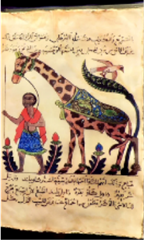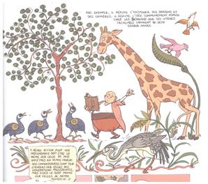 Ils donnent aussi au personnage l’occasion d’expliquer au lecteur que la rigueur scientifique de son auteur était basée sur le doute et que, bien qu’inspiré par Aristote, il osa le contredire, par exemple, en réfutant l’existence des dragons et des chimères. Le texte originel est même cité dans la bande dessinée, où les différentes péripéties de ce manuscrit (volé, vendu, revolé, rendu, perdu) permettent de multiplier les références à l’ouvrage. Les dessins naïfs d’animaux, copiés du manuscrit, créent une continuité esthétique qui permet de combler l’écart intellectuel entre un jeune lecteur d’aujourd’hui et un manuscrit médiéval, pour mieux souligner l’apport de la civilisation musulmane médiévale en matière de zoologie (Fig. 15).