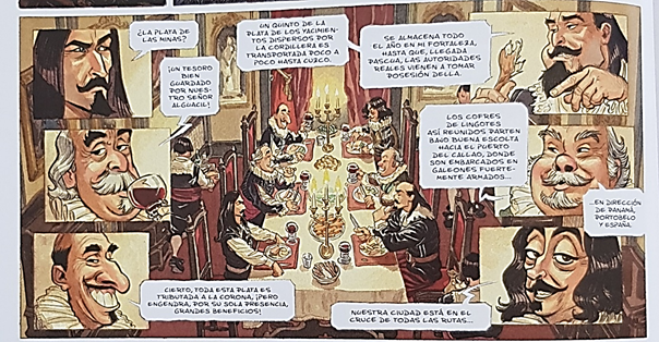 Dentro de este dispositivo de lectura específico, los autores se valen también de recursos visuales que manifiestan las posibilidades expositivas y expresivas de una novela gráfica. Es el caso, por ejemplo, con el episodio de una cena que reúne a don Diego7 con unos dignitarios en Cuzco.