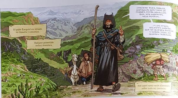 Siguiendo el modelo de la picaresca, El Buscón en las Indias se abre con un relato en primera persona. Precisamente, para advertir al lector que no lo supiera, el álbum empieza con un Prefacio que lo recuerda de entrada: «La novela picaresca, que floreció durante el Siglo de Oro español, narra en primera persona la vida de un bribón». Esta característica ofrece, en la transficción dibujada, toda una red de cartelas, que marcan las etapas del relato. Se presentan bajo la forma de una hoja de papel usado, casi como pergamino, retomando así la tradición de testimonio, de autoficción, de fuente (seudo) auténtica y (seudo) fidedigna que fundamenta las novelas picarescas. Las cartelas revelan al lector todas las impresiones del narrador autodiegético e incluso, a veces, se escenifica la ironía de sus análisis, como por ejemplo (Fig. 4) en la página 38: una amplia tira representa al padre Ezequiel en primer plano, Pablos le sigue, y un majestuoso paisaje andino ocupa todo el fondo de la imagen.
