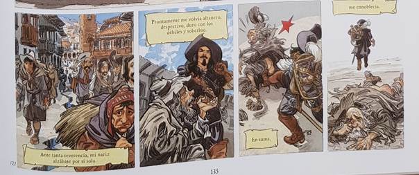Estos guiños al lector permiten asimismo introducir una reflexión sobre la condición humana y social en tiempos de la Conquista. La página 125 marca una pausa en las peripecias del pícaro para cuestionar la barbarie, la búsqueda de fortuna y las traiciones. De manera sintética (Fig. 12), se reúnen imágenes previas del álbum –a veces con enfoque distintito del inicial– que son el soporte visual retrospectivo de la mirada distanciada de Pablos sobre sus aventuras: