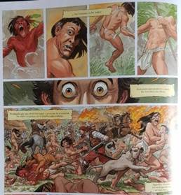 En el primer capítulo de El Buscón en las Indias, Guarnido y Ayroles le dan totalmente la vuelta a esta mitificación en torno a seres monstruosos en una impactante página (p.30), en la que se representa toda una serie de actos bárbaros de violencia por parte de conquistadores que están masacrando a indios, convirtiéndolos en cuerpos quemados vivos, devorados vivos por perros, cuerpos a los que los españoles quitan, con sus armas, ojos, piernas y cabezas pero, por supuesto, que no tienen nada que ver con monstruosos pueblos mitológicos. La composición misma de esta página recalca la extrema crueldad del encuentro (Fig. 8):