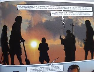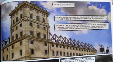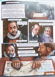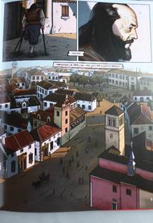 Si le décor de la ville est déterminé par le quartier où habite Juan de Olite, ce qui frappe dans la vue de Madrid, légèrement en plongée, c’est la présence très marquée des espaces religieux. Pas moins de trois campaniles et deux croix apparaissent dans la vignette qui occupe plus de la moitié de la page comme pour signifier l’importance du répérage spatial dans l’ouverture du récit. Cette empreinte religieuse, rehaussée dans l’encadré par la mention de la date suivie de « nuestro señor » introduit le point de vue espagnol de la défense du catholicisme en ces premiers temps de la Contre-Réforme dont Philippe II, suivant sa vision messianique, se fit le champion en promulgant les décrets tridentins, dès 1563, comme lois de ses royaumes. Le ton est donné dès la première page de la bande dessinée : cette identité religieuse inaugure la perception du temps. La guerre des Flandres sera abordée à travers les enjeux et les intérêts espagnols tels que le prédicateur catholique Lorenzo de Villavicencio le rappelle au roi le 6 octobre 1566 :