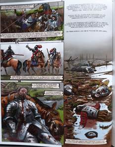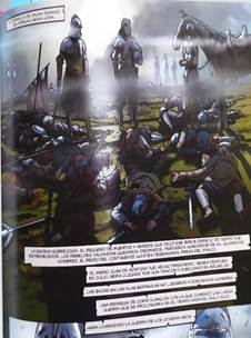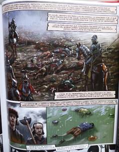 « Heiligerlee sería recordada como una humillante derrota para los españoles »17, les vignettes montrent en gros plan la désolation de l’échec du camp espagnol avec un sol jonché de cadavres. La nature dévastée souligne l’ampleur du désastre militaire. La boue mélangée au sang offre un terrible spectacle de mort qui bouche l’horizon d’une brume épaisse de désespoir. L’espace est représenté en accord chromatique avec la situation déplorable des personnages.