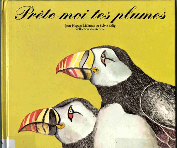 Illustration 1. 1re de couverture de Jean-Hugues Malineau, Prête-moi tes plumes, ill. Sylvie Selig, École des loisirs, coll. « Chanterime », 1978.