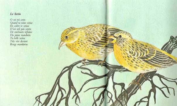Illustration 3. Jean-Hugues Malineau, Prête-moi tes plumes, ill. Sylvie Selig, École des loisirs, coll. « Chanterime », 1978 : « Le Serin »