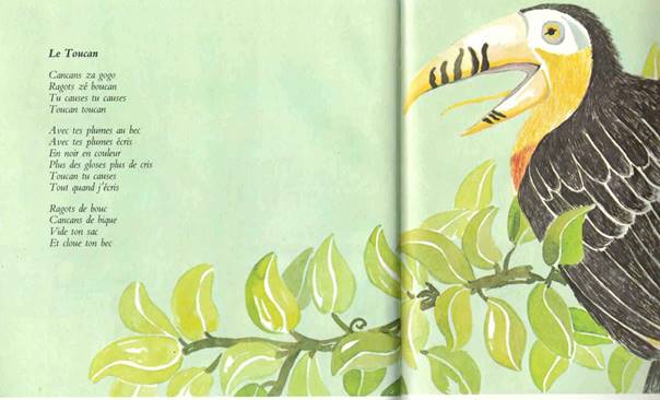Illustration 4. Jean-Hugues Malineau, Prête-moi tes plumes, ill. Sylvie Selig, École des loisirs, coll. « Chanterime », 1978 : « Le Toucan »