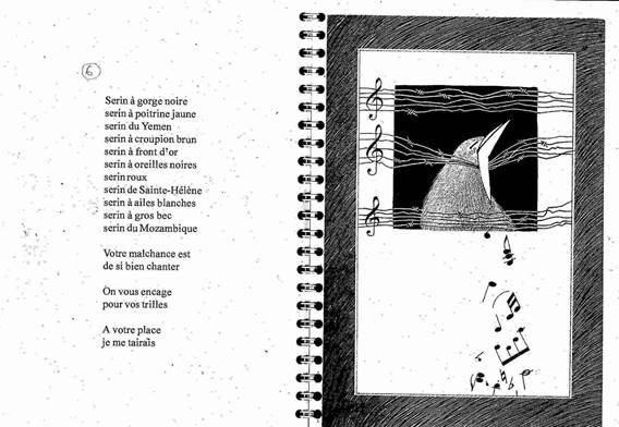 Illustration 8. Michel Besnier, ill. Véronique Boiry, Le verlan des oiseaux, Møtus, coll. « Pommes Pirates Papillons », 2001 : poème 6 (Le serin)
