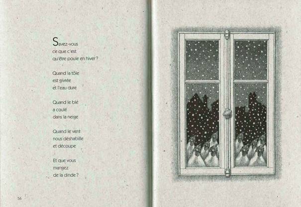 qui évoque à la fois la mort souvent tragique de la poule ou des volailles lors des fêtes de Noël en particulier, mais aussi en filigrane le sort des sans-abris dont l’exclusion est renforcée à cette époque35 ; l’illustration d’Henri Galeron avec ces poules qui regardent à la fenêtre, mais de l’extérieur, insiste bien sur ce sentiment de détresse et sur le parallèle avec les exclus.